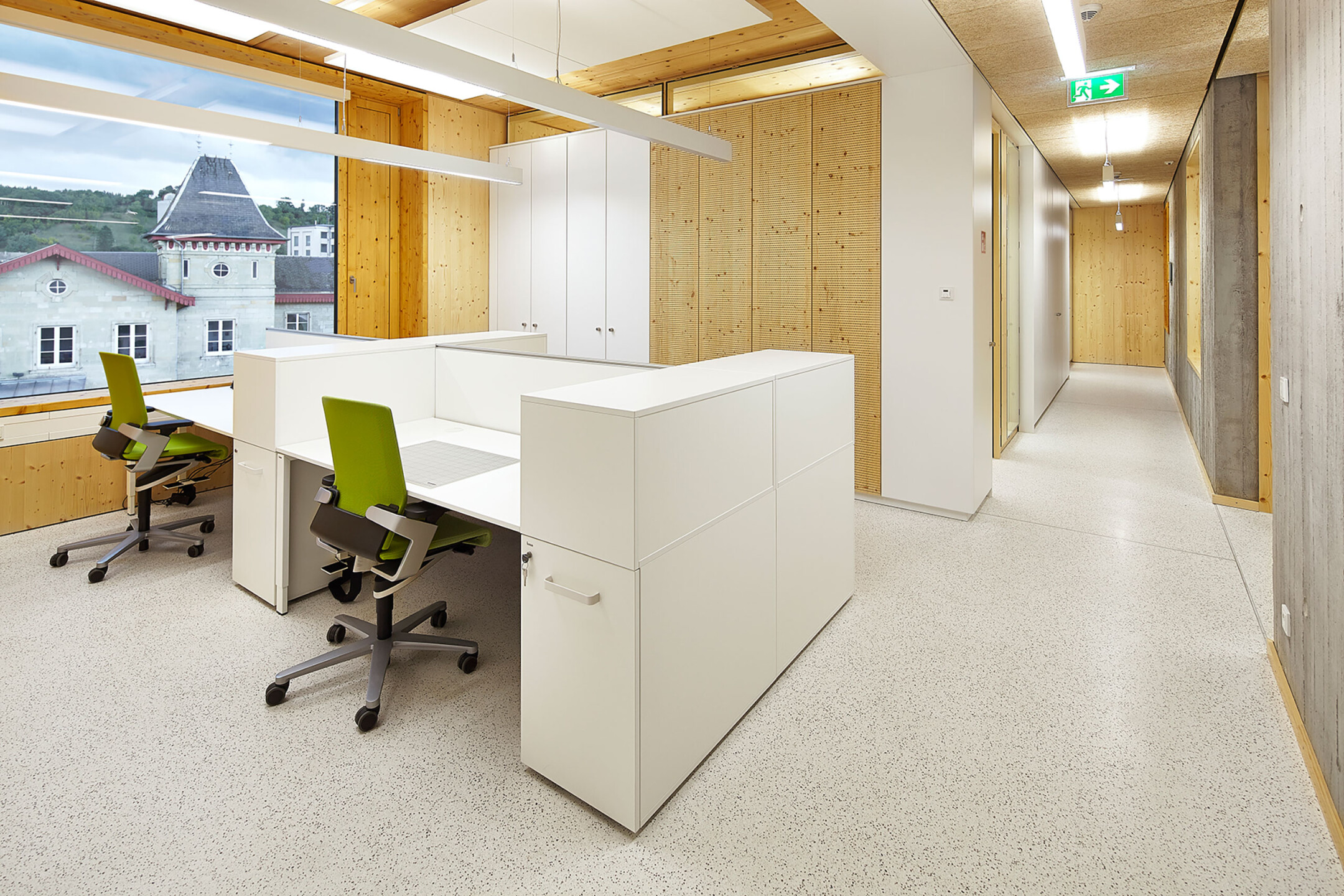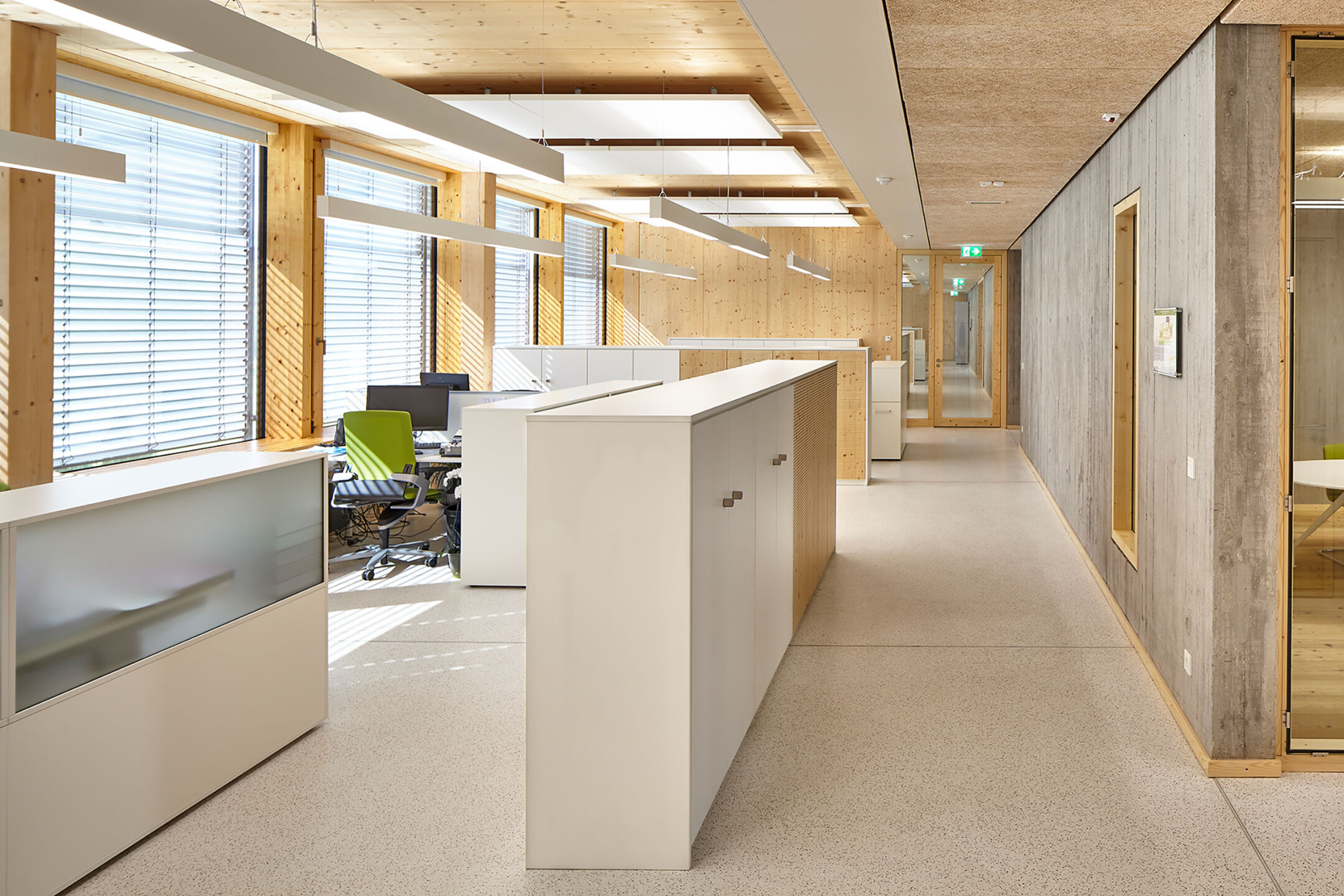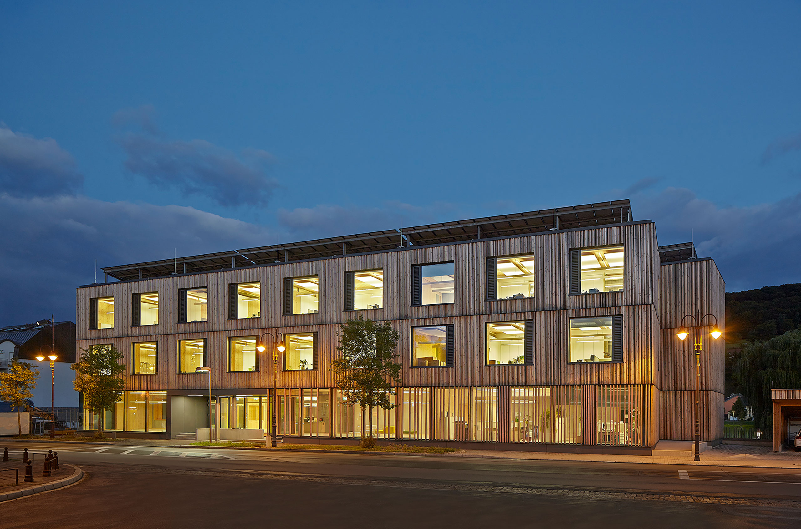 In der Mitte ein massiver Betonkern mit den Servicebereichen, Treppenhäusern, Nasszellen und der vertikalen Technikverteilung. Darunter das in Beton ausgeführte Untergeschoss mit Archiven, Lagerräumen und der Technik. Dieses Konzept bietet die Vorteile einer leichten Außenhülle in Holzbauweise mit optimierten thermischen und bauphysikalischen Eigenschaften und einem schweren inneren Kern als Speichermasse, welcher als Garant für geringe Temperaturschwankungen in den Innenräumen steht. Darüber hinaus wurde die Anzahl der Materialien der Hauptstruktur konsequent auf die beiden Grundmaterialien Holz und Beton reduziert, was dem Gebäude eine natürliche Ruhe und Klarheit verleiht. Die individuelle Holzfassade führt die Thematik konsequent weiter und verleiht dem Gebäude seinen einzigartigen Charakter. In technischer Hinsicht ist das Gebäude auf einen äußerst geringen Energiebedarf ausgelegt, welcher wiederum aus regenerativen Quellen gewonnen wird. Gekühlt und geheizt wird das Gebäude mittels einer Wärmepumpe, die ihre Energie aus dem Flusswasser der vorbei fließenden Sauer gewinnt und über den Zementestrich an die Innenräume abgibt. Durch das einfache Konzept einer manuellen Querlüftung mittels einer Vielzahl von schmalen Lüftungsflügeln mit vorgelagerten Strömungsgittern in der Nord- und Südfassade kann die Betriebsdauer der mechanischen und zonengesteuerten Lüftungsanlage deutlich reduziert werden. Die Elektroinstallationen und die Kunstlichtanlagen konnten exakt auf die Bedürfnisse und das Verhalten der Gebäudenutzer angepasst werden.