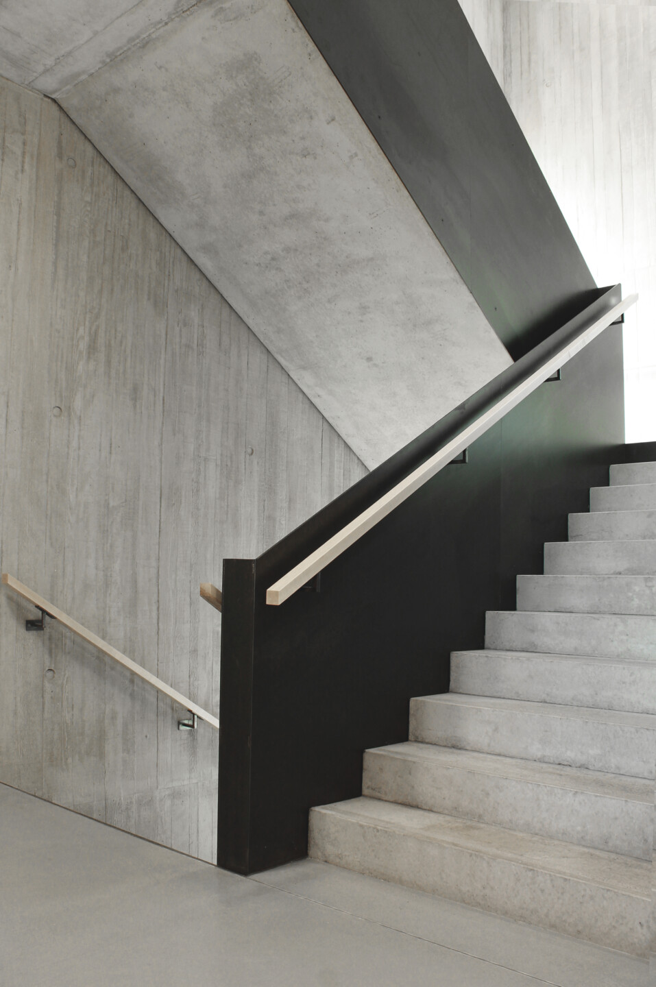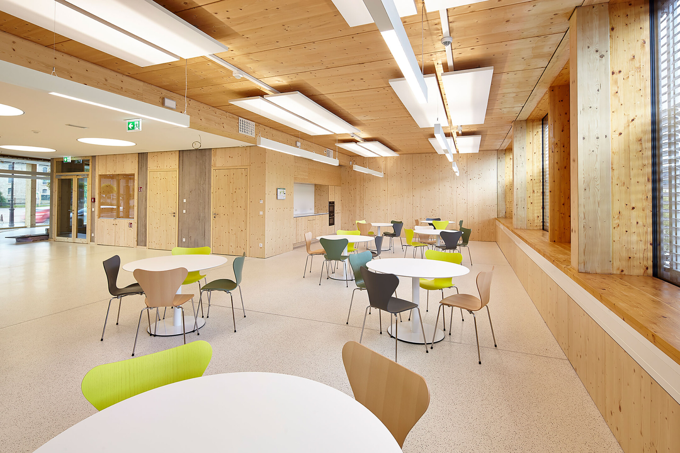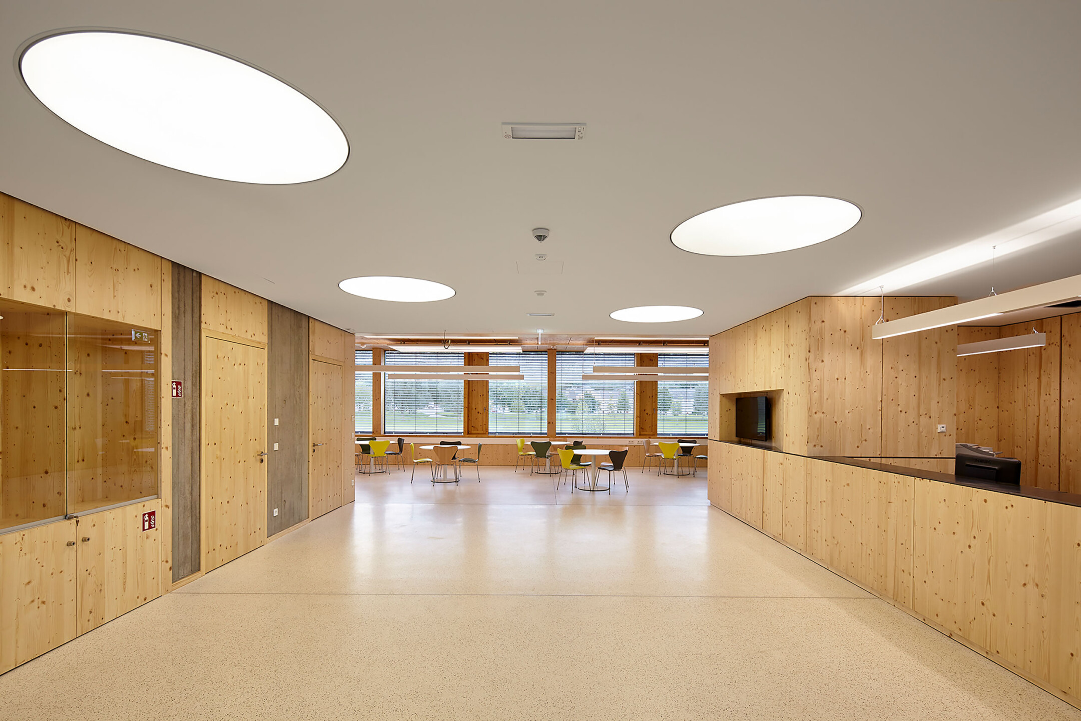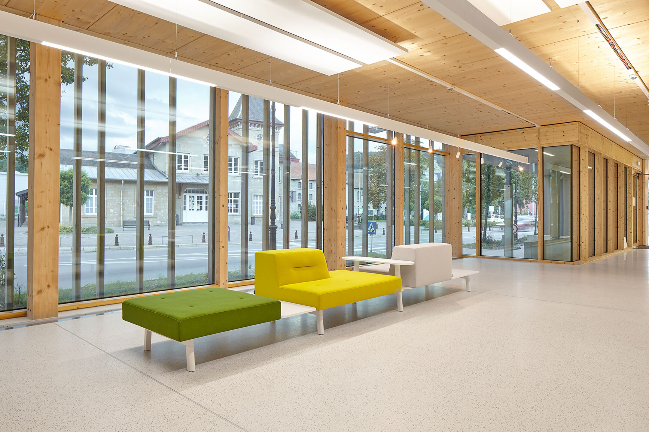 In der Mitte ein massiver Betonkern mit den Servicebereichen, Treppenhäusern, Nasszellen und der vertikalen Technikverteilung. Darunter das in Beton ausgeführte Untergeschoss mit Archiven, Lagerräumen und der Technik. Dieses Konzept bietet die Vorteile einer leichten Außenhülle in Holzbauweise mit optimierten thermischen und bauphysikalischen Eigenschaften und einem schweren inneren Kern als Speichermasse, welcher als Garant für geringe Temperaturschwankungen in den Innenräumen steht. Darüber hinaus wurde die Anzahl der Materialien der Hauptstruktur konsequent auf die beiden Grundmaterialien Holz und Beton reduziert, was dem Gebäude eine natürliche Ruhe und Klarheit verleiht. Die individuelle Holzfassade führt die Thematik konsequent weiter und verleiht dem Gebäude seinen einzigartigen Charakter. In technischer Hinsicht ist das Gebäude auf einen äußerst geringen Energiebedarf ausgelegt, welcher wiederum aus regenerativen Quellen gewonnen wird. Gekühlt und geheizt wird das Gebäude mittels einer Wärmepumpe, die ihre Energie aus dem Flusswasser der vorbei fließenden Sauer gewinnt und über den Zementestrich an die Innenräume abgibt. Durch das einfache Konzept einer manuellen Querlüftung mittels einer Vielzahl von schmalen Lüftungsflügeln mit vorgelagerten Strömungsgittern in der Nord- und Südfassade kann die Betriebsdauer der mechanischen und zonengesteuerten Lüftungsanlage deutlich reduziert werden. Die Elektroinstallationen und die Kunstlichtanlagen konnten exakt auf die Bedürfnisse und das Verhalten der Gebäudenutzer angepasst werden.