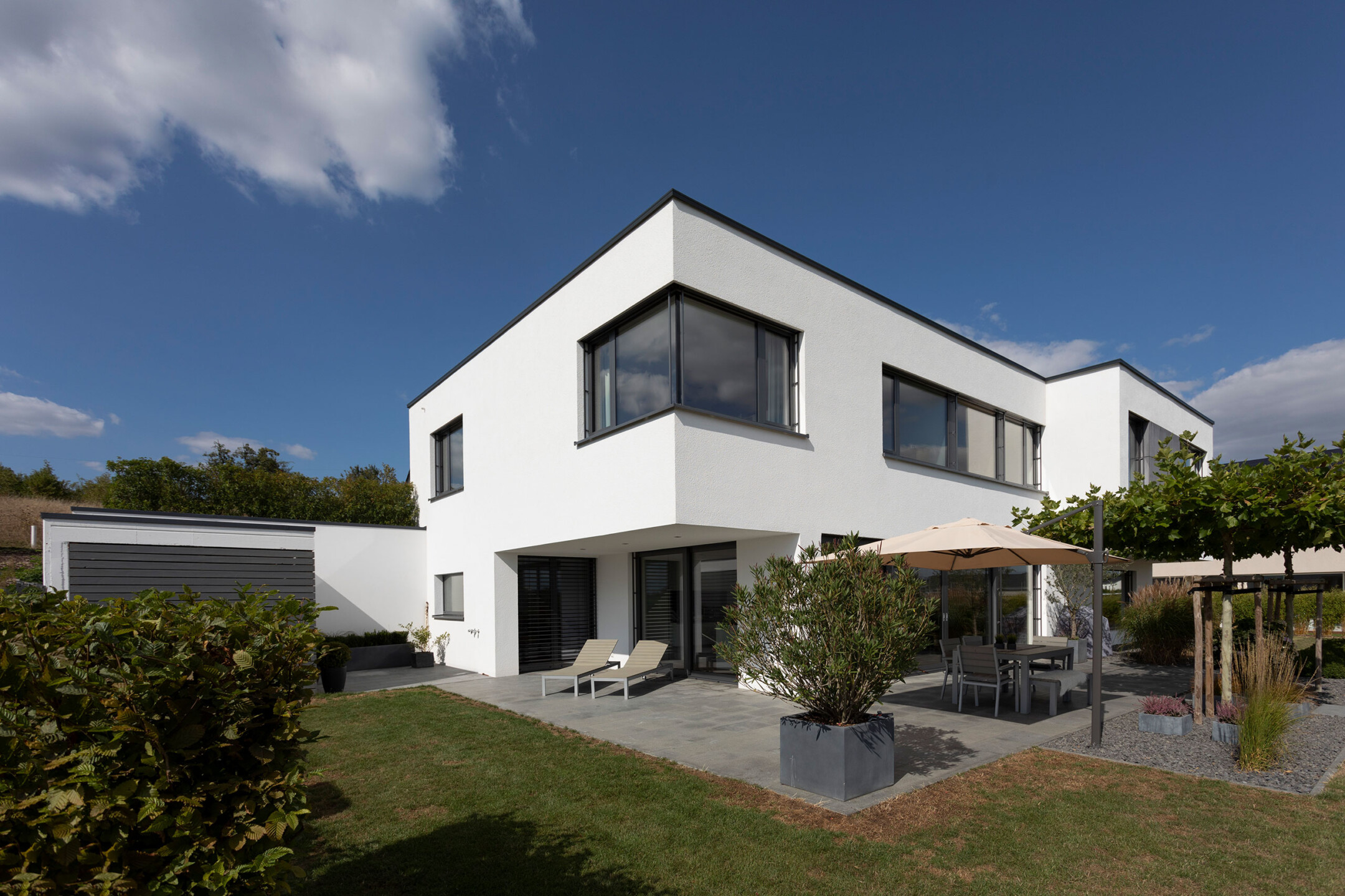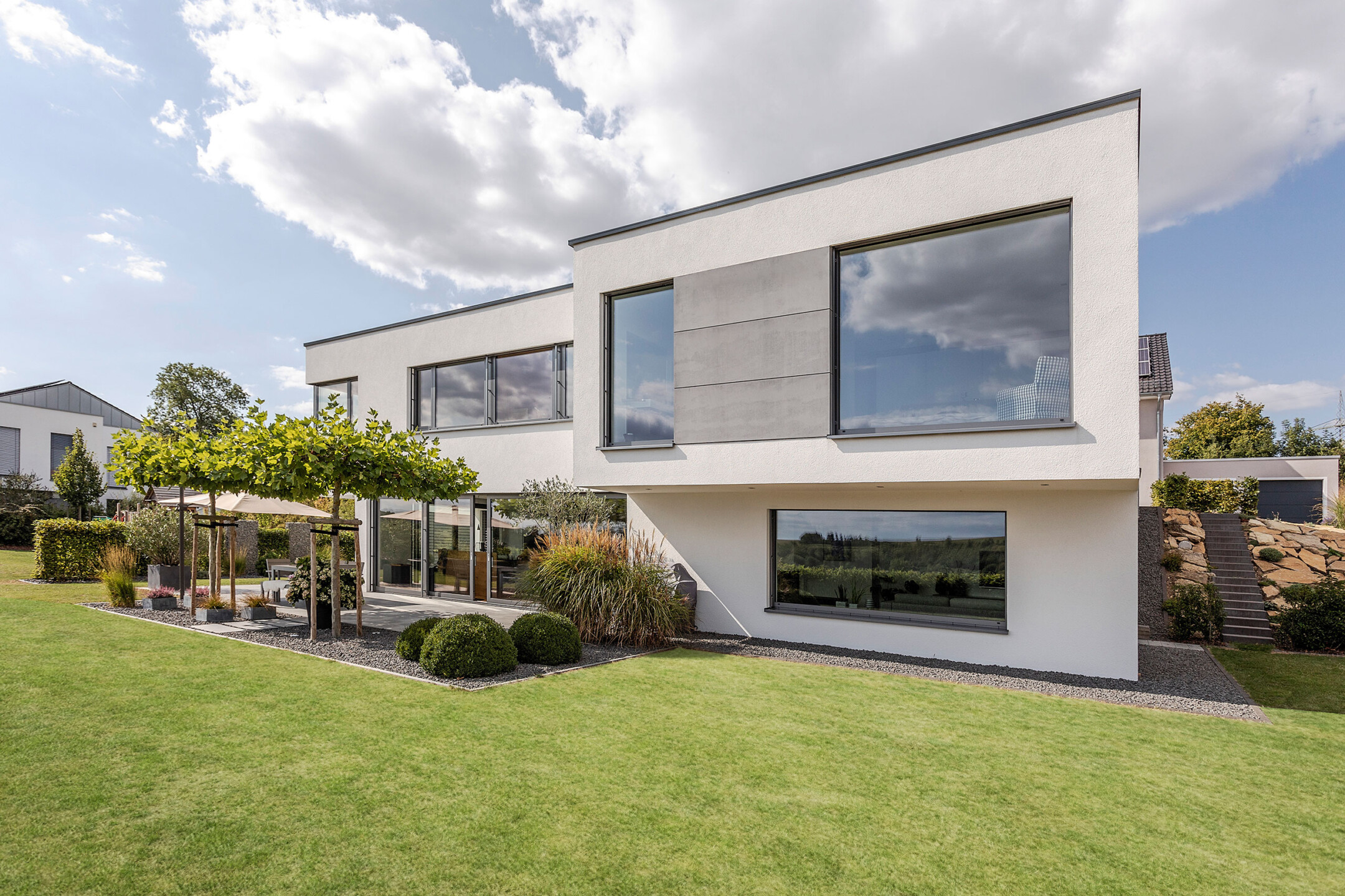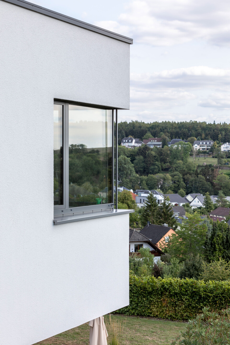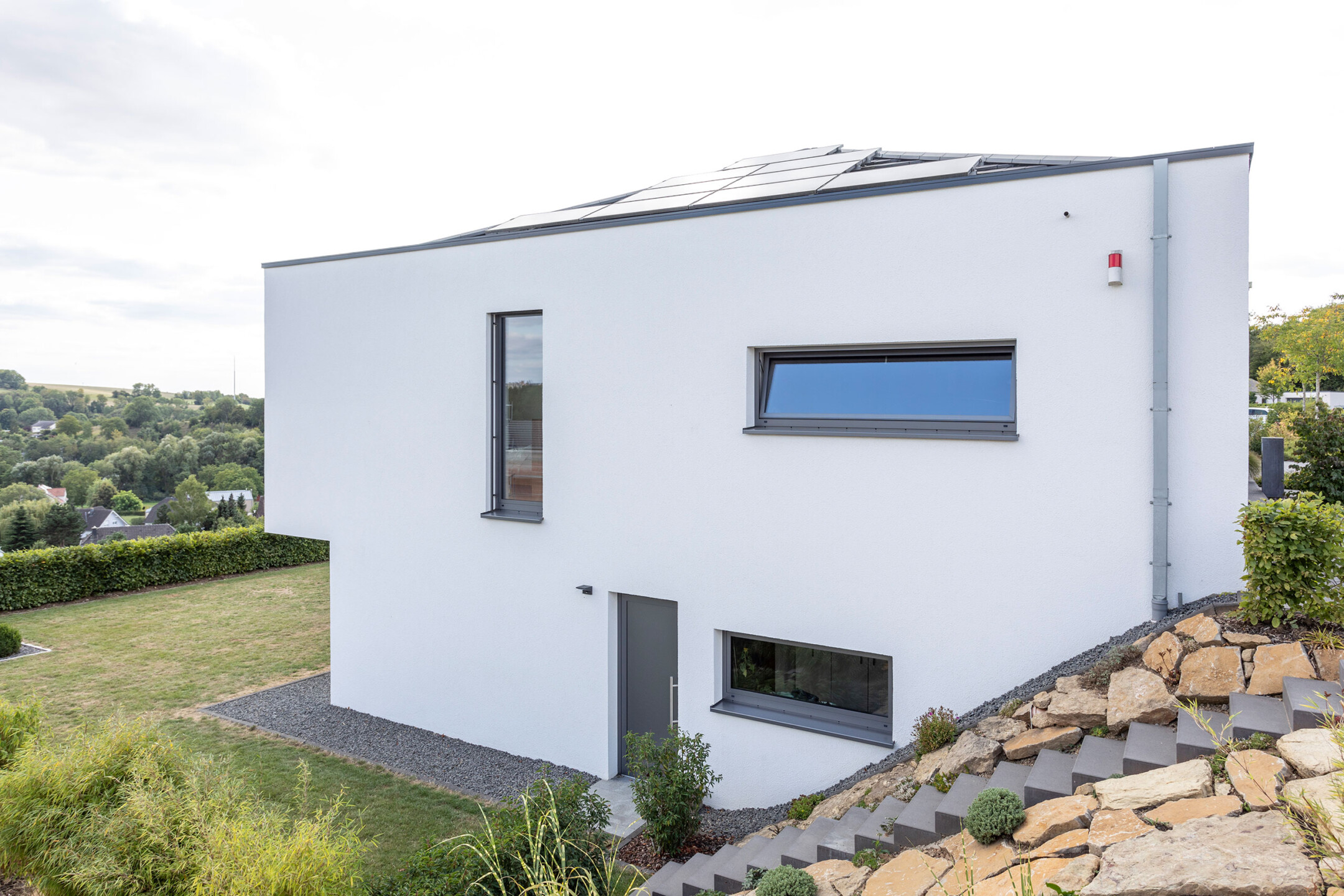 Das Einfamilienhaus orientiert sich konsequent nach seiner optimalen Lage im Südhang. Der einladende Eingangsbereich auf dem oberen Straßenniveau führt über die offene stets erlebbare Treppe in die untere Wohnebene. Das große Eingangsfenster leitet das Licht über das Treppenhaus durch die gesamten hinteren Raumbereiche. Große Fensteröffnungen gewährleisten beeindruckende Ausblicke und fließende Übergänge der Innen- und Außenräume. Der geschützte, überdachte Außenbereich im Westen bietet Sitzmöglichkeiten in der Abendsonne. Die eigentliche Flachdacharchitektur wird in Form eines zurückgesetzten leichten Walmdaches finalisiert. Dieser differenziert wirkende Dachaufbau ermöglicht die Installation der Photovoltaikanlagen und bietet zusätzlichen Lagerraum. Die weiße Architektur der Putzfassade steht im kontrastreichen Wechsel mit den Bereichen der Zementplattenfassaden. Es entsteht ein klares, ruhiges und auch spannendes Gesamtbild.