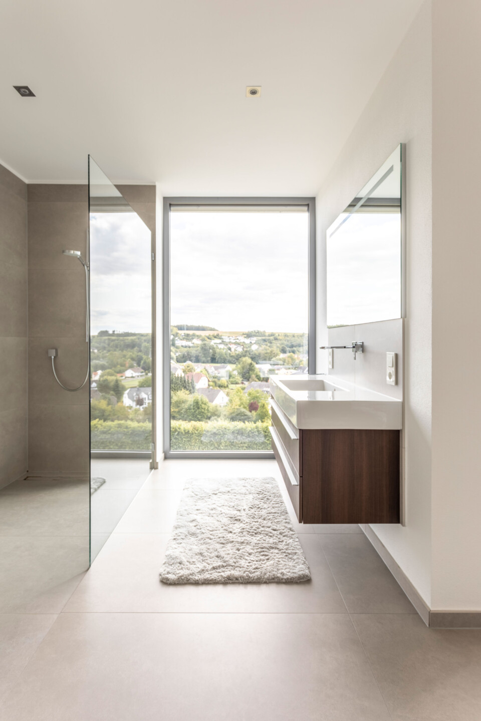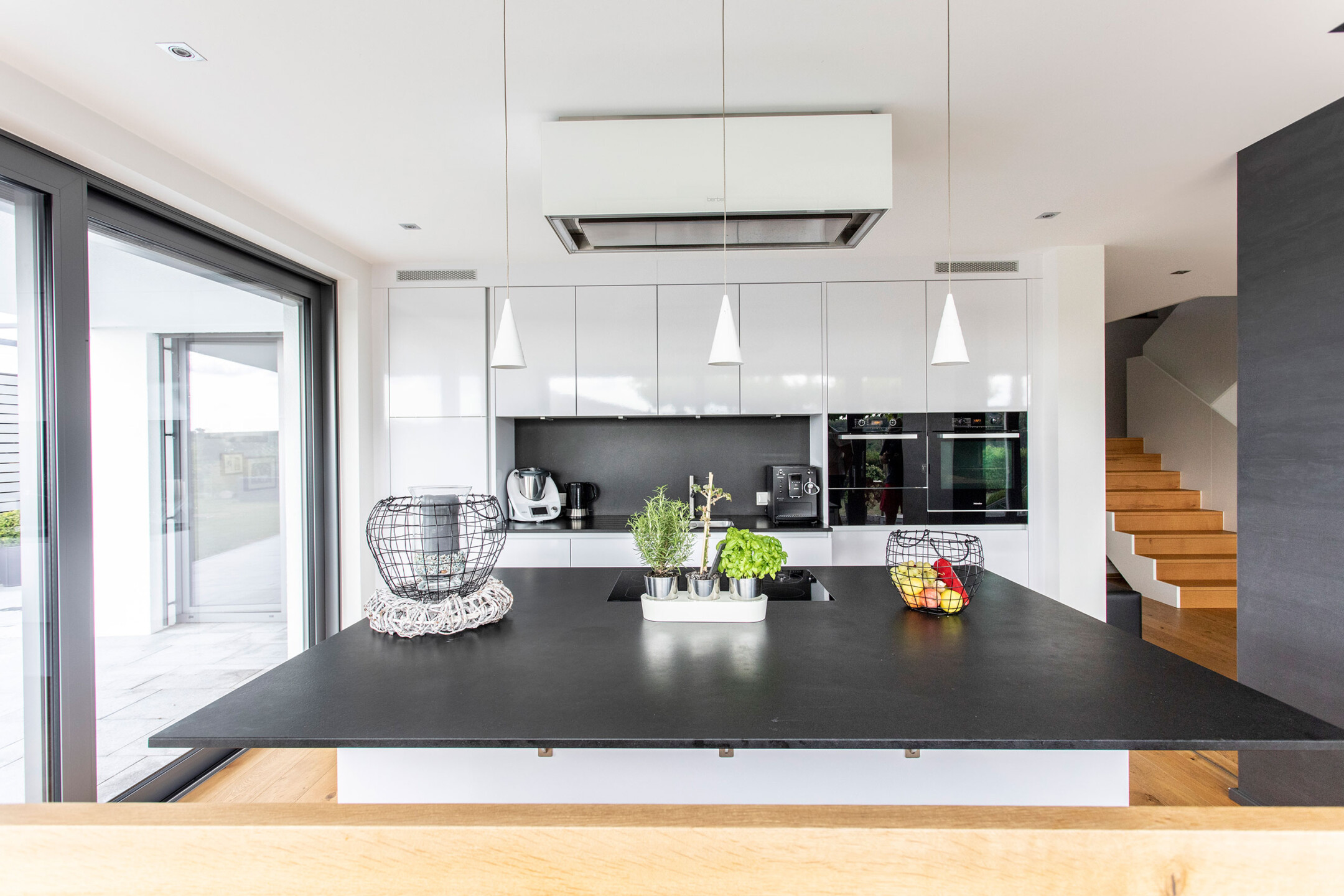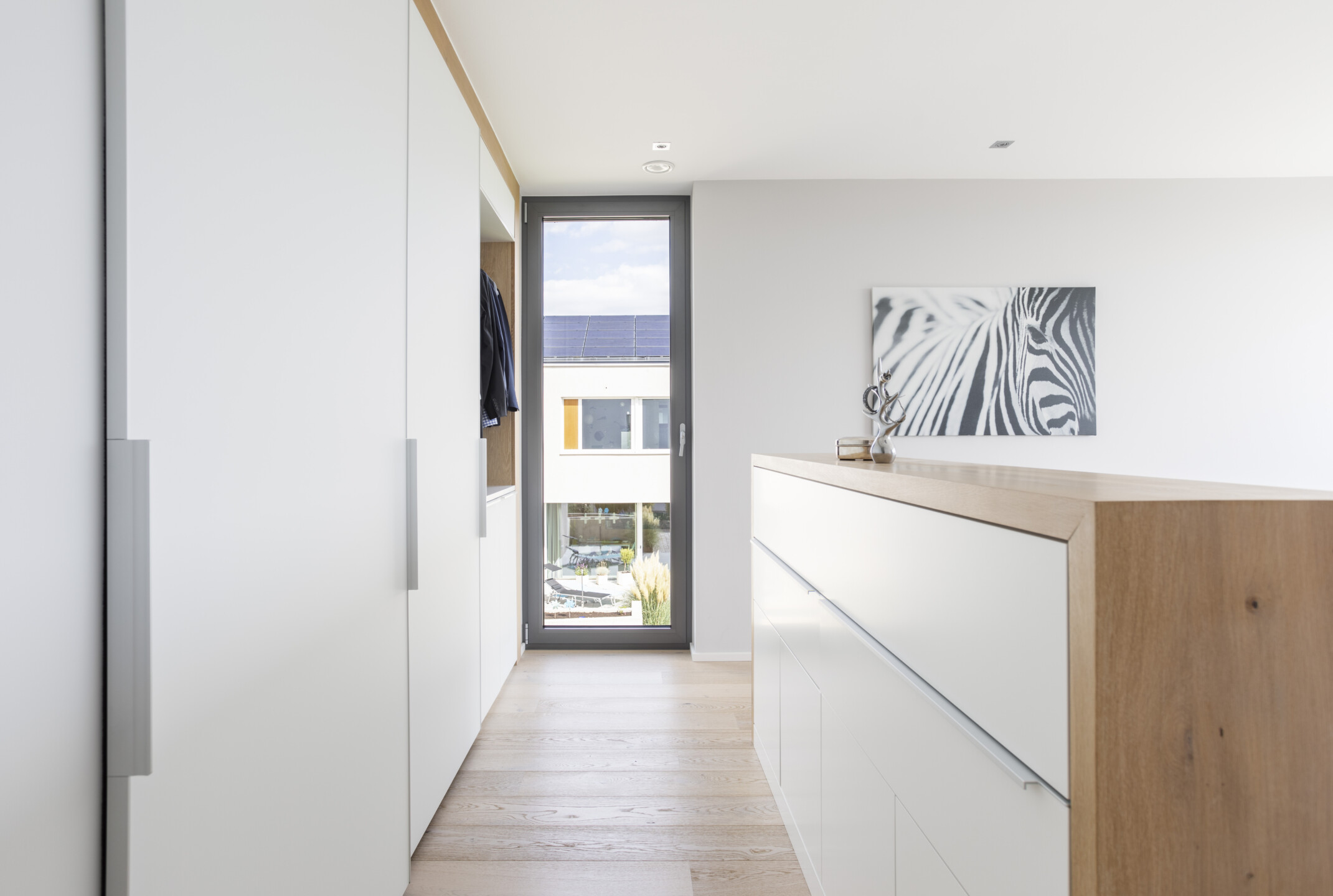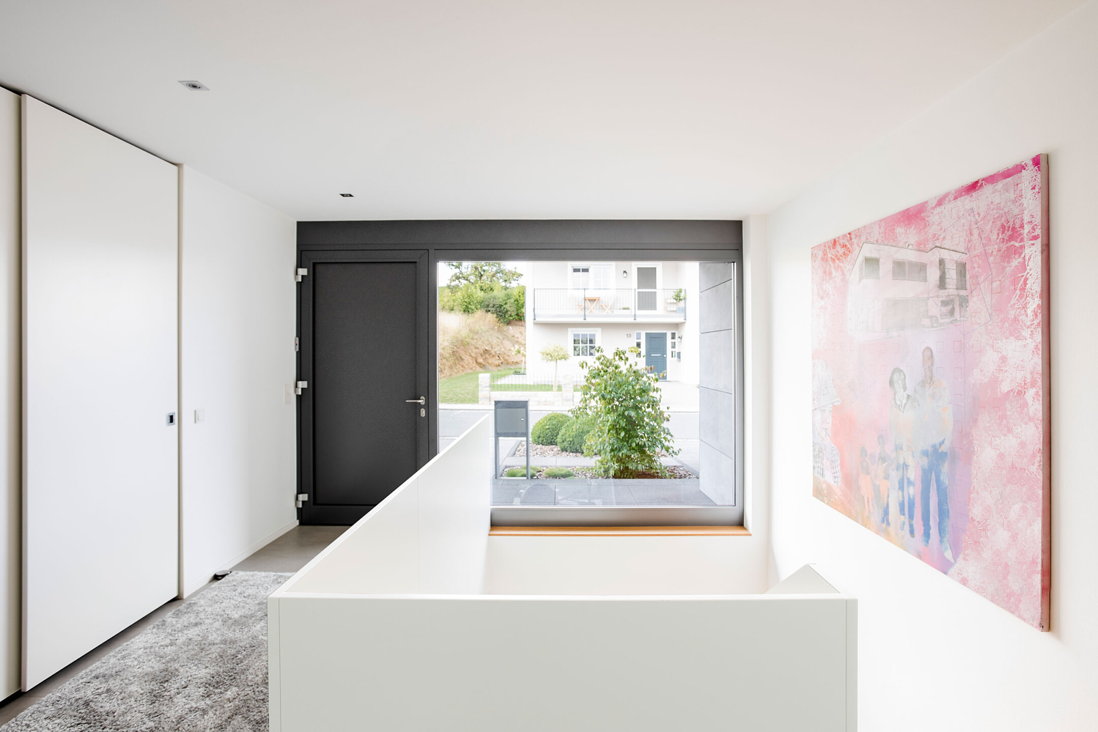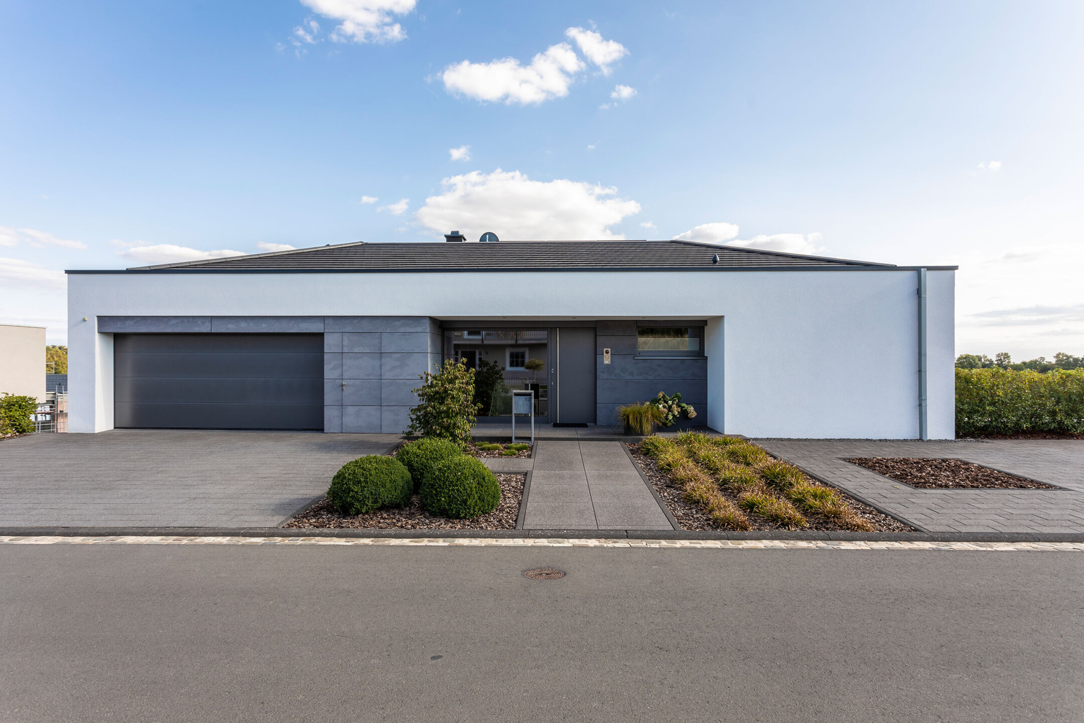 Das Einfamilienhaus orientiert sich konsequent nach seiner optimalen Lage im Südhang. Der einladende Eingangsbereich auf dem oberen Straßenniveau führt über die offene stets erlebbare Treppe in die untere Wohnebene. Das große Eingangsfenster leitet das Licht über das Treppenhaus durch die gesamten hinteren Raumbereiche. Große Fensteröffnungen gewährleisten beeindruckende Ausblicke und fließende Übergänge der Innen- und Außenräume. Der geschützte, überdachte Außenbereich im Westen bietet Sitzmöglichkeiten in der Abendsonne. Die eigentliche Flachdacharchitektur wird in Form eines zurückgesetzten leichten Walmdaches finalisiert. Dieser differenziert wirkende Dachaufbau ermöglicht die Installation der Photovoltaikanlagen und bietet zusätzlichen Lagerraum. Die weiße Architektur der Putzfassade steht im kontrastreichen Wechsel mit den Bereichen der Zementplattenfassaden. Es entsteht ein klares, ruhiges und auch spannendes Gesamtbild.