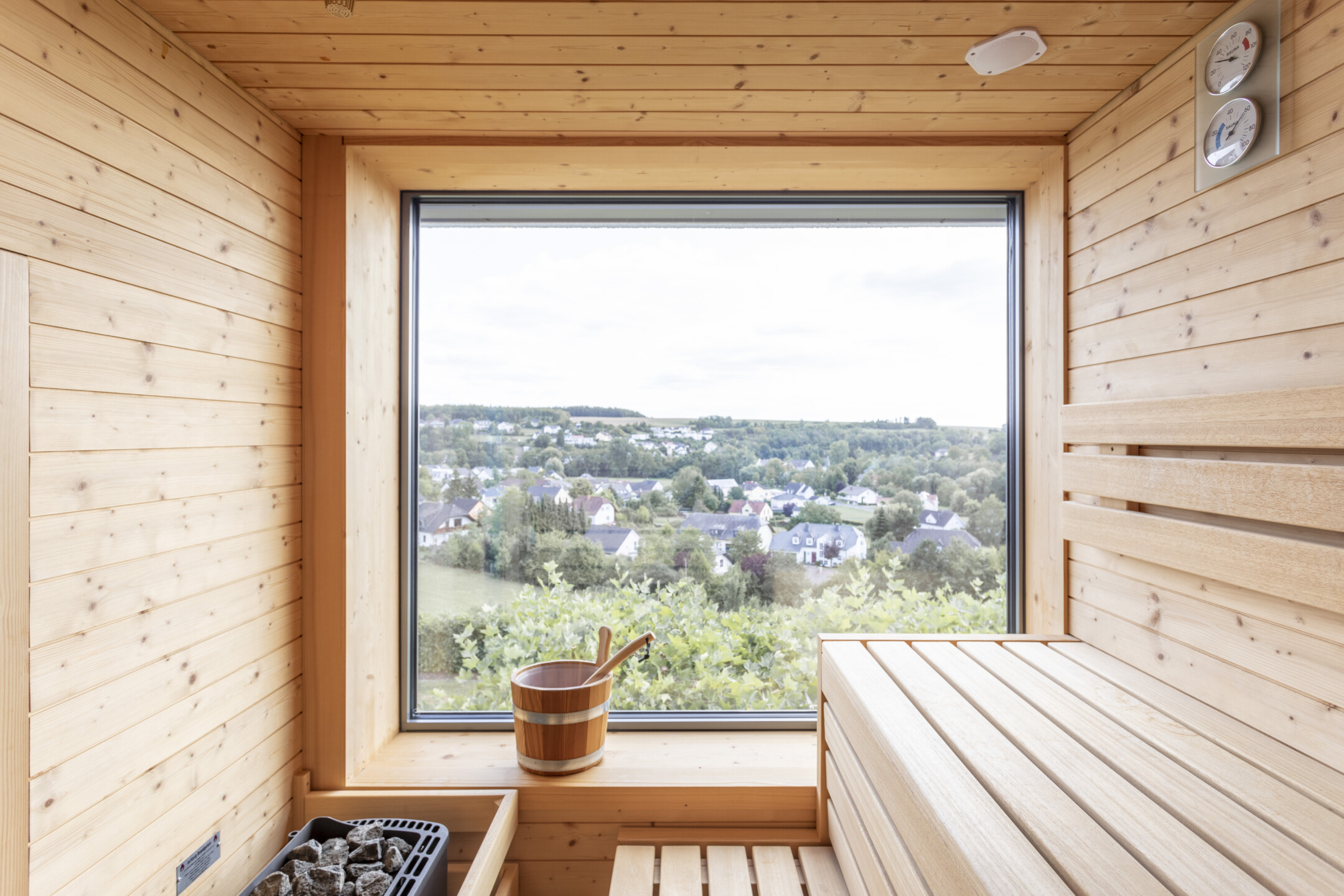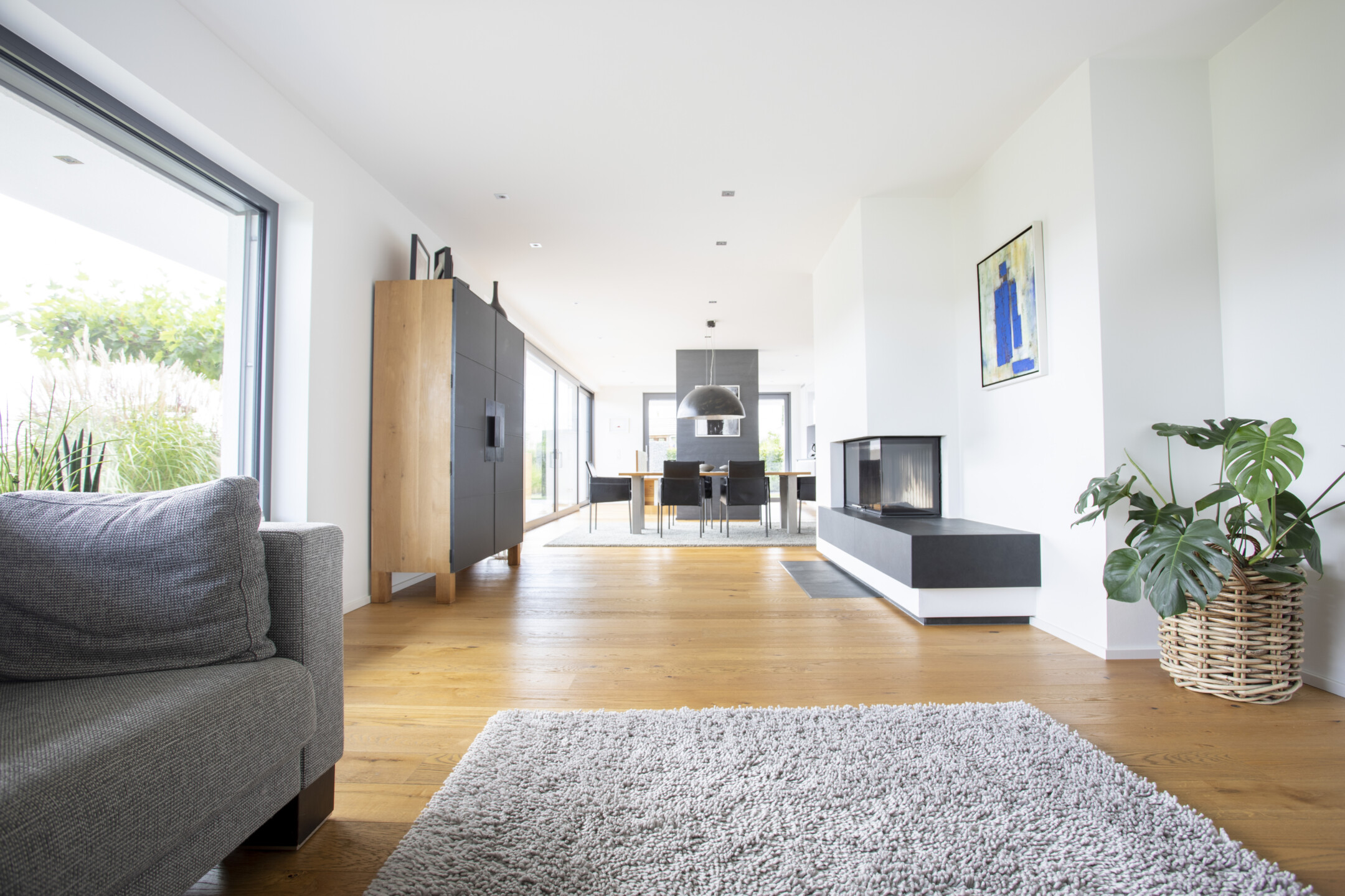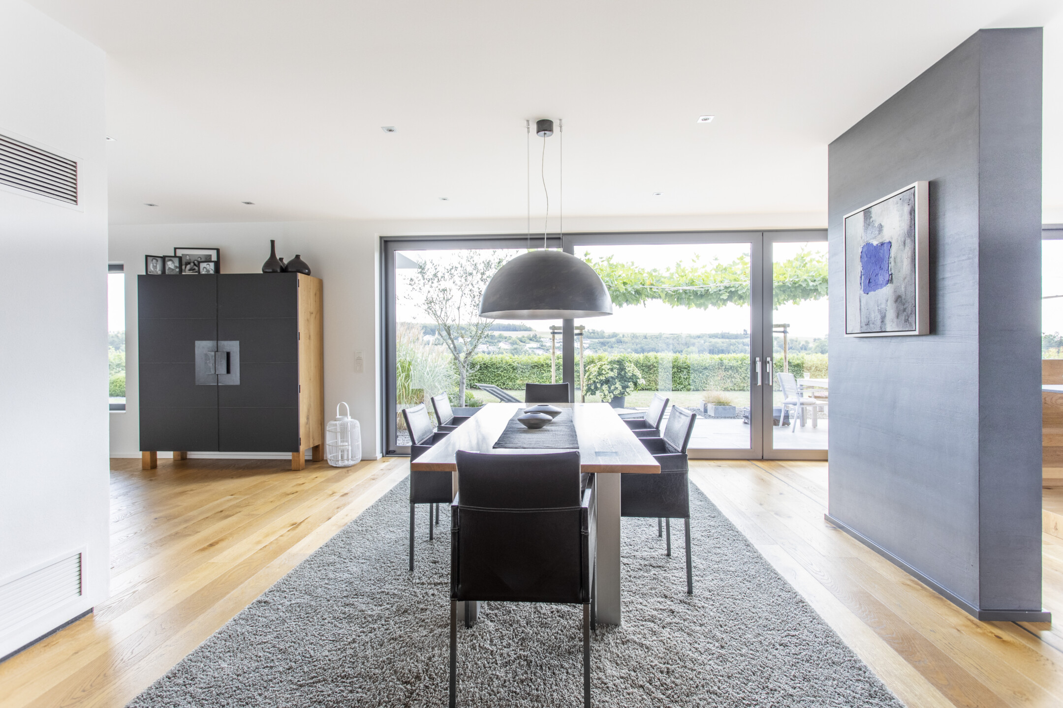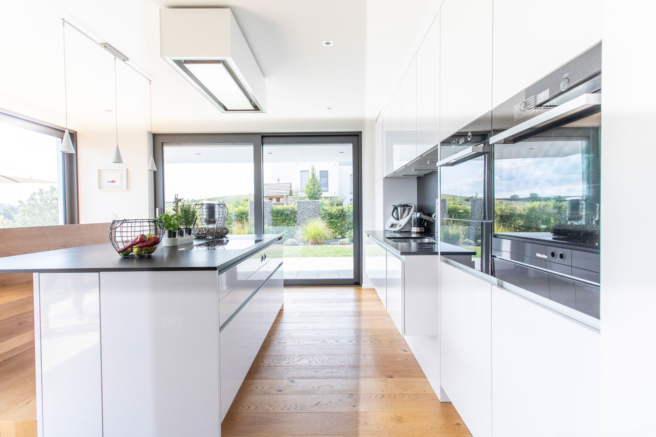 Das Einfamilienhaus orientiert sich konsequent nach seiner optimalen Lage im Südhang. Der einladende Eingangsbereich auf dem oberen Straßenniveau führt über die offene stets erlebbare Treppe in die untere Wohnebene. Das große Eingangsfenster leitet das Licht über das Treppenhaus durch die gesamten hinteren Raumbereiche. Große Fensteröffnungen gewährleisten beeindruckende Ausblicke und fließende Übergänge der Innen- und Außenräume. Der geschützte, überdachte Außenbereich im Westen bietet Sitzmöglichkeiten in der Abendsonne. Die eigentliche Flachdacharchitektur wird in Form eines zurückgesetzten leichten Walmdaches finalisiert. Dieser differenziert wirkende Dachaufbau ermöglicht die Installation der Photovoltaikanlagen und bietet zusätzlichen Lagerraum. Die weiße Architektur der Putzfassade steht im kontrastreichen Wechsel mit den Bereichen der Zementplattenfassaden. Es entsteht ein klares, ruhiges und auch spannendes Gesamtbild.