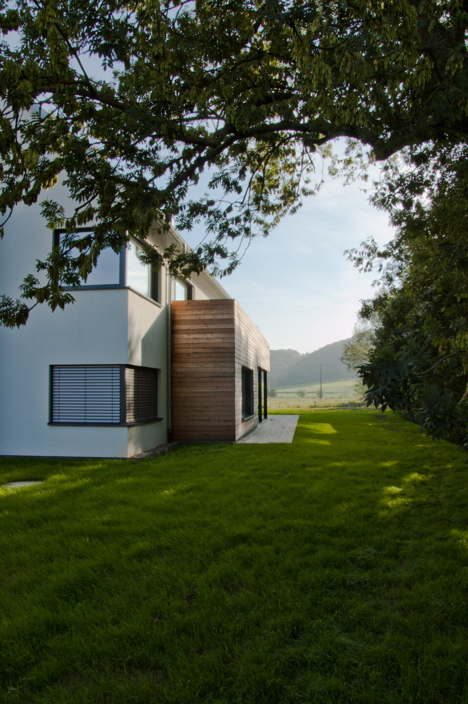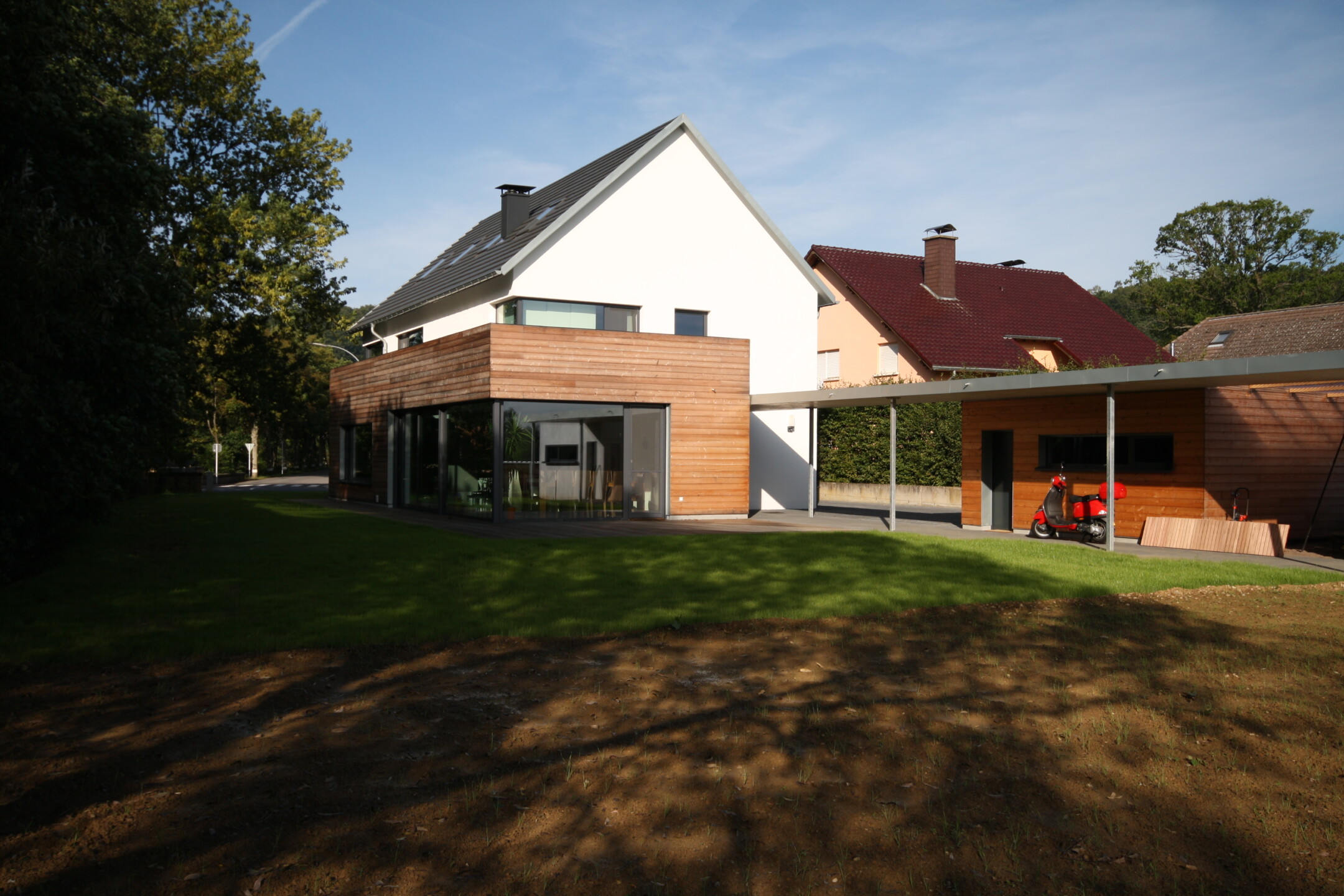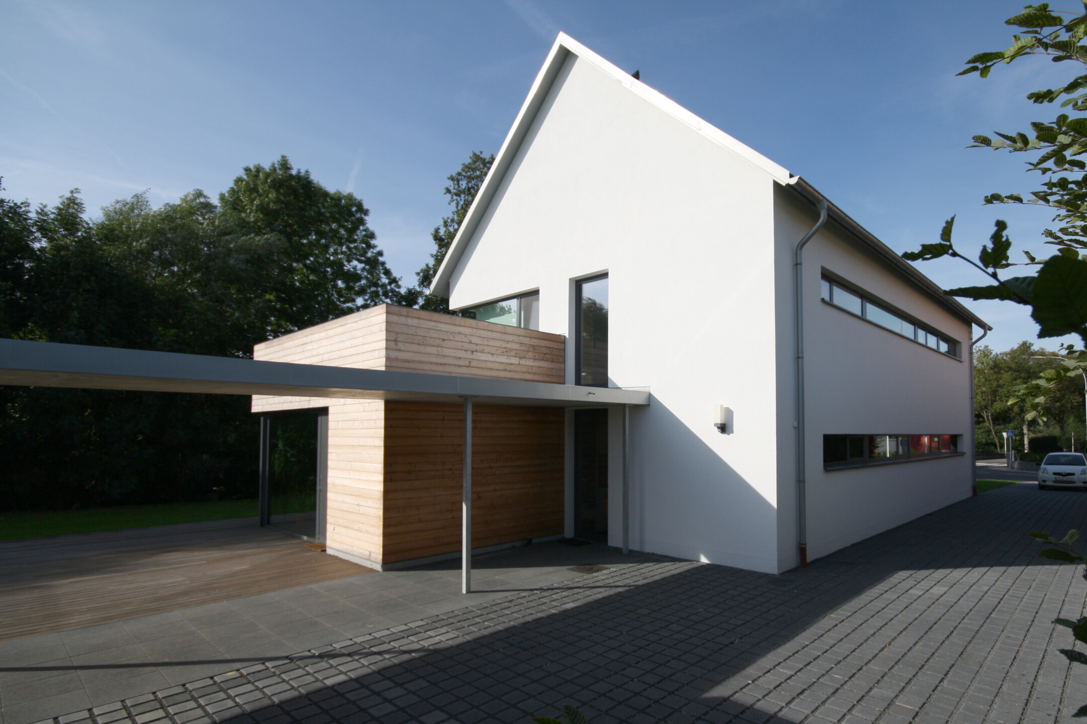 Der Ort in Dorfmitte, geprägt durch sein natürliches Umfeld durch Fluss, Bäume und großen Wiesenflächen erhält eine Bebauung die sich zunächst, straßenseitig als zurückhaltendes Satteldachhaus darstellt. Einzig das zweigeschossige Eingangselement aus Holz kündigt das Ensemble an: das Haupthaus mit weißer Putzfassade, ein pavillonartiger Anbau, die Doppelgarage und das Atelier in Holzlattenfassade aus sibirischer Lärche. Die An- und Nebenbauten sind das Ergebnis der maximal möglichen Bebaubarkeit des Grundstücks nach den Auflagen der Gemeinde aber auch in Form und Material wichtige Kontraste zum Hauptbaukörper. Die rückwärtigen solitären Nebengebäude stehen in direkter Verbindung zum Wohnhaus durch einen befestigten „Steg“ mit einer filigranen Betonüberdachung der sich im Innern als Erschließung durch den gesamten Grundriss fortführt. Gezielte Öffnungen und die große Galerie geben den Innenräumen eine natürliche Belichtung und den direkten Bezug nach außen zur Natur.
